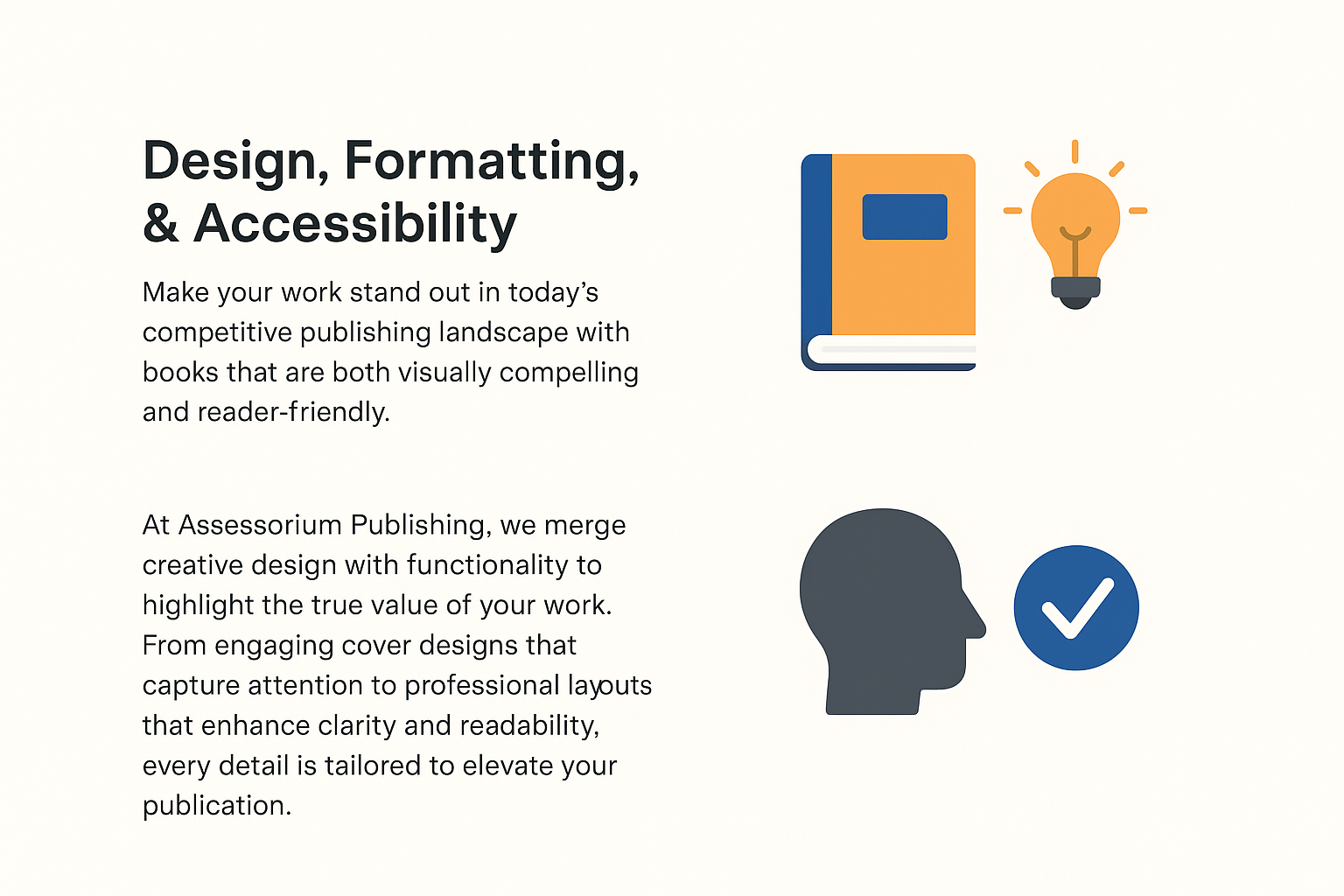 Make your work stand out in today’s competitive publishing landscape with books that are both visually compelling and reader-friendly. At Assessorium Publishing, we merge creative design with functionality to highlight the true value of your work. From engaging cover designs that capture attention to professional layouts that enhance clarity and readability, every detail is tailored to elevate your publication.