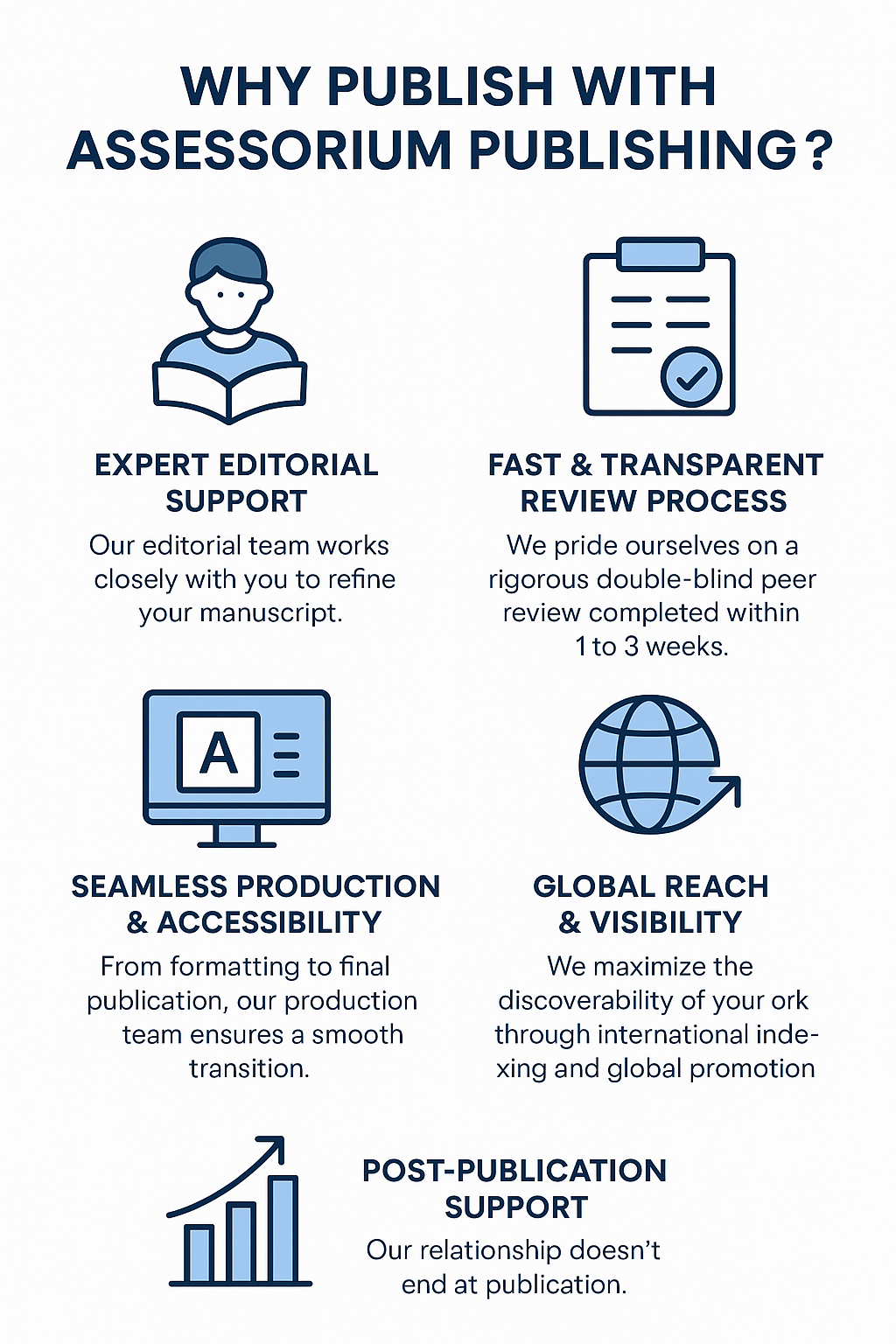 Assessorium Publishing is committed to maximizing the discoverability of your work. Through international indexing, open access availability, and global promotion, we ensure your research is visible and impactful across academic and professional communities.